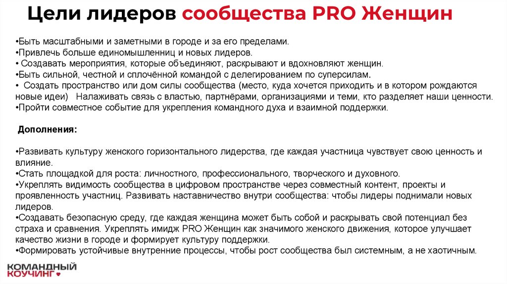 Цели лидеров сообщества PRO Женщин•Быть масштабными и заметными в городе и за его пределами.