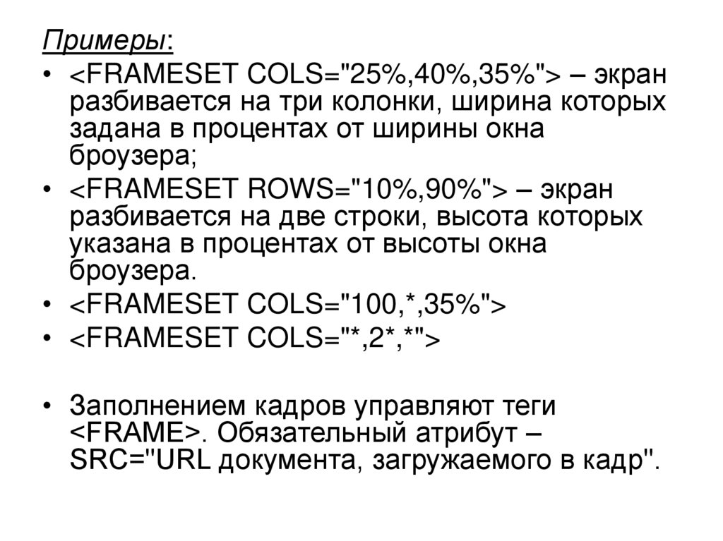 Примеры:• <FRAMESET COLS="25%,40%,35%"> – экран