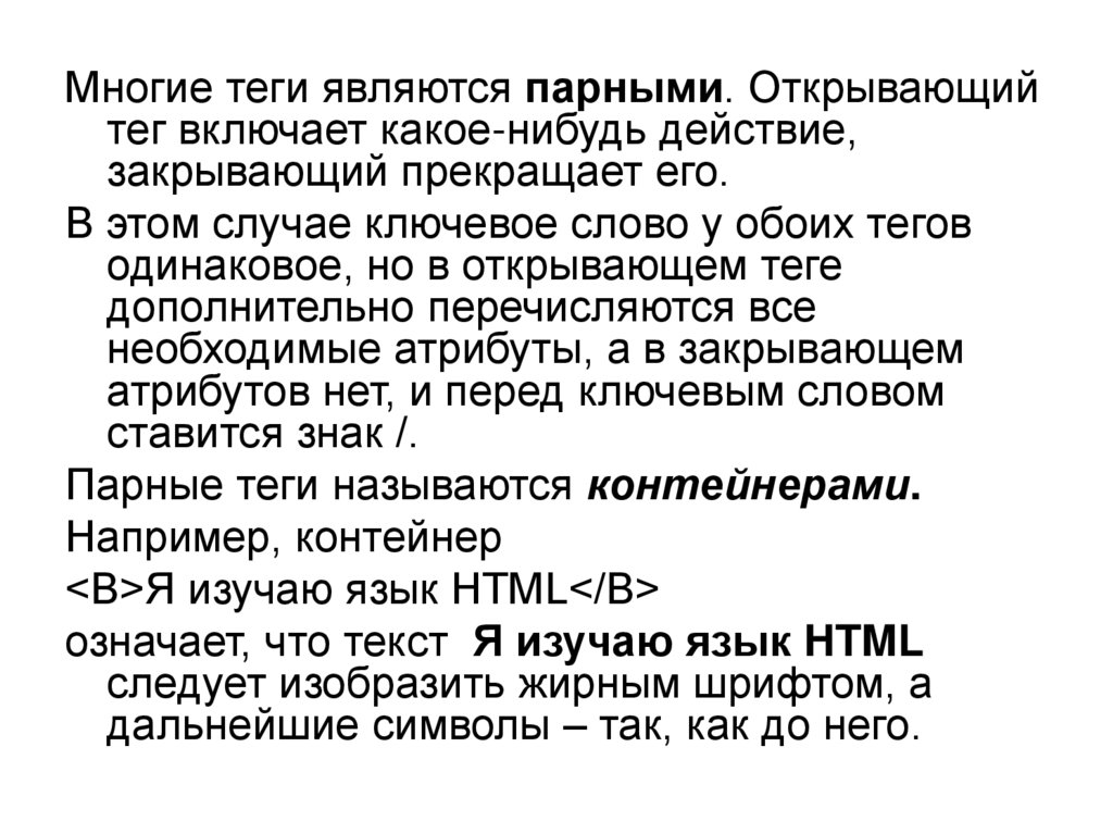Многие теги являются парными. Открывающийтег включает какое-нибудь действие,