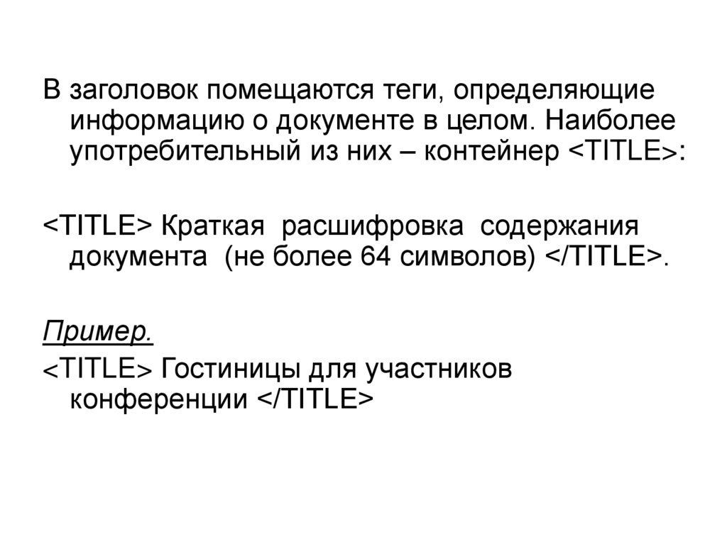 В заголовок помещаются теги, определяющиеинформацию о документе в целом. Наиболее
