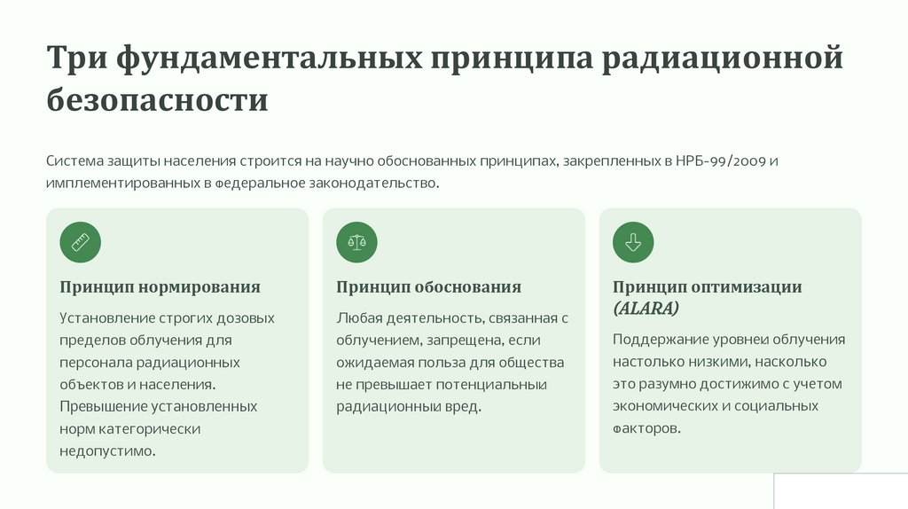 Система защиты населения строится на научно обоснованных принципах, закрепленных в НРБ-99/2009 и