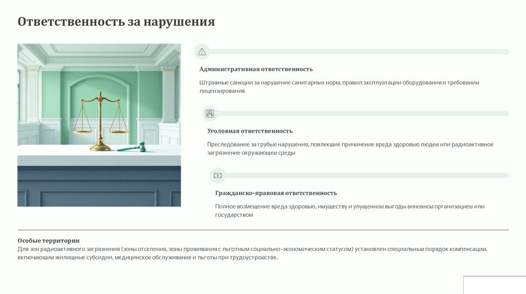 Для зон радиоактивного загрязнения (зоны отселения, зоны проживания с льготным социально-экономическим статусом) установлен специальный порядок компенсаций,