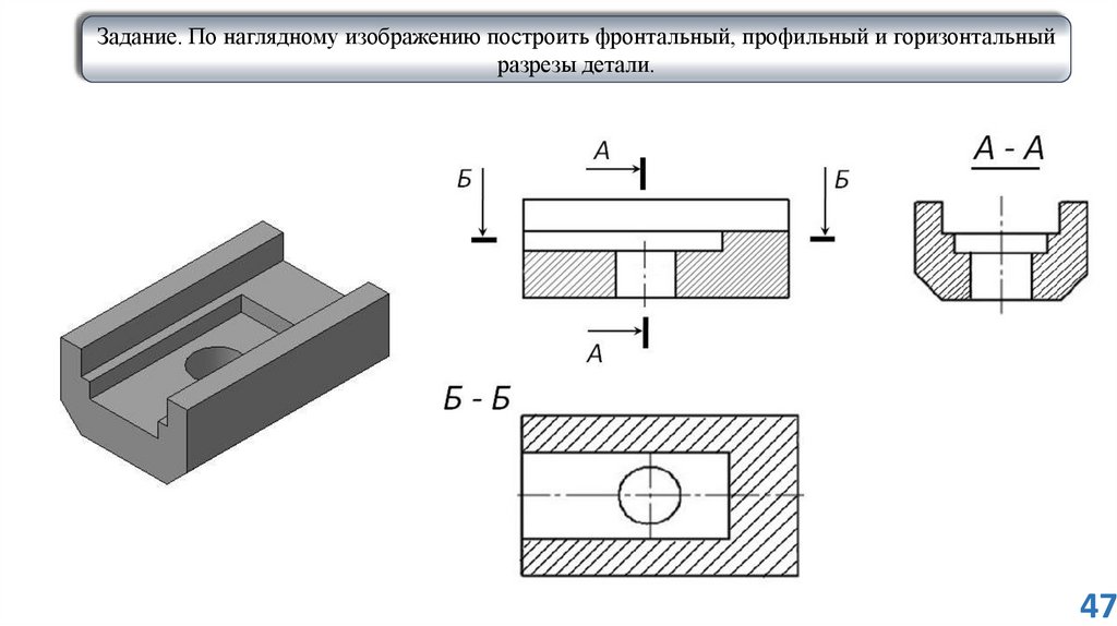 Задание. По наглядному изображению построить фронтальный, профильный и горизонтальныйразрезы детали.