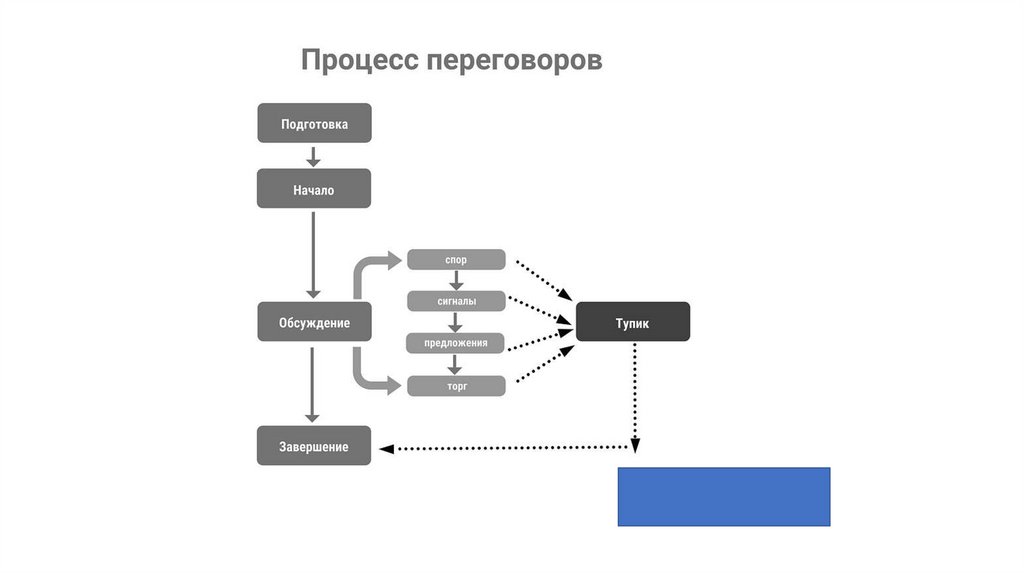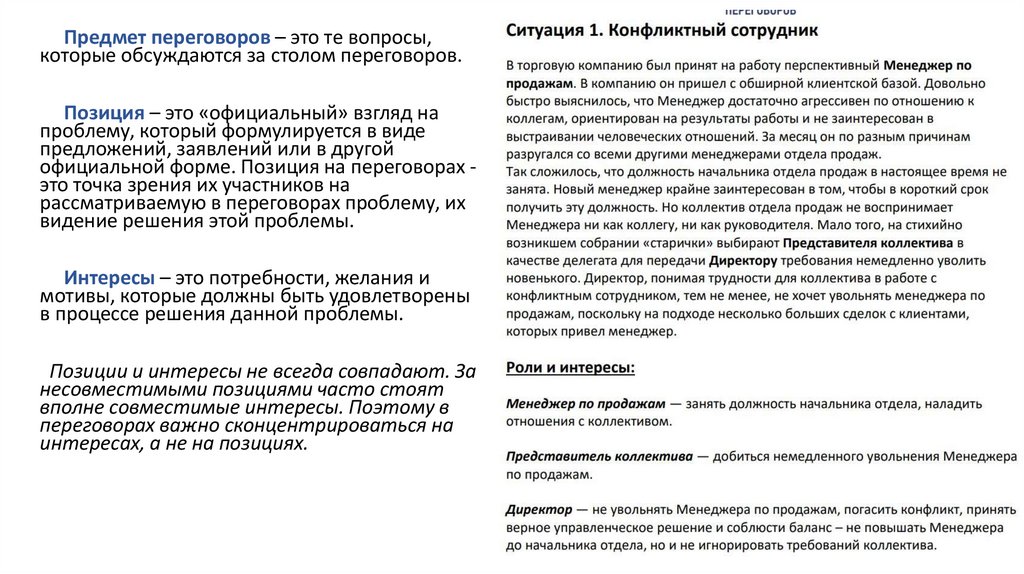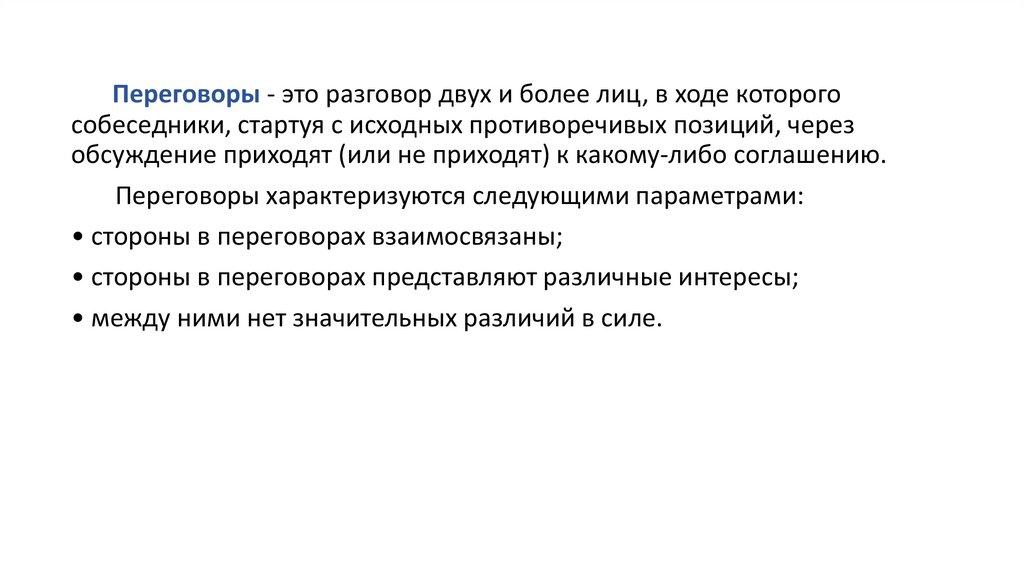 Переговоры - это разговор двух и более лиц, в ходе которогособеседники, стартуя с исходных противоречивых позиций, через