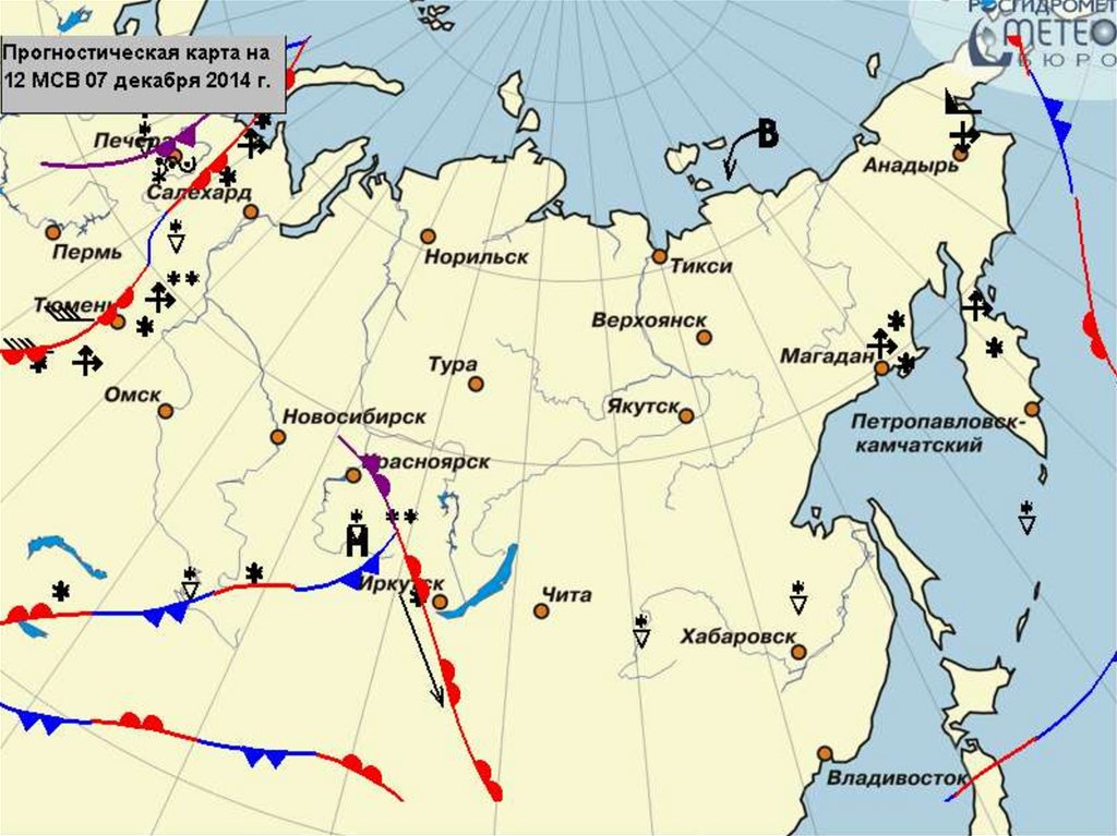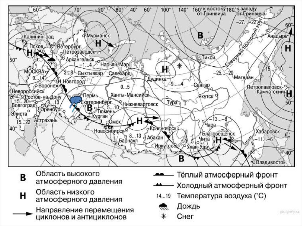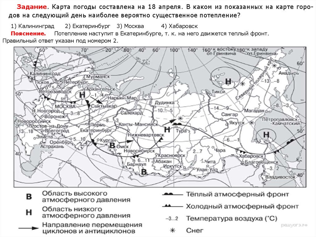 Решение. Карта погоды составлена на 18 апреля. В каком из показанных на карте городов на следующий день наиболее вероятно существенное похолодание?1) Екатеринбург 2) Москва 3) Ханты-Мансийск 4) Элиста