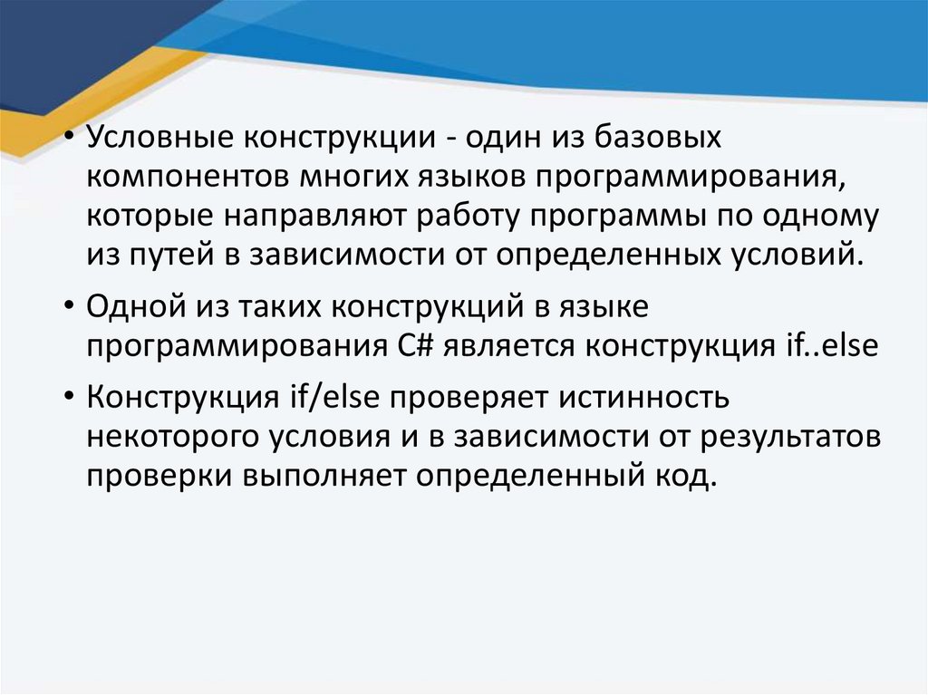 • Условные конструкции - один из базовыхкомпонентов многих языков программирования,