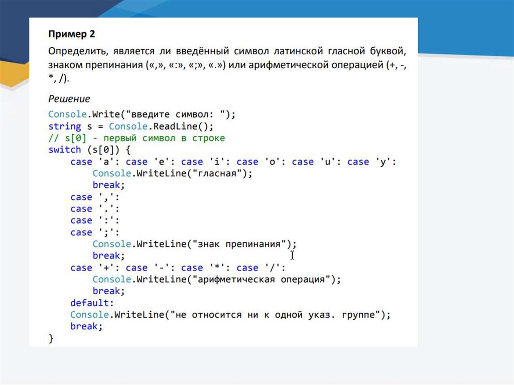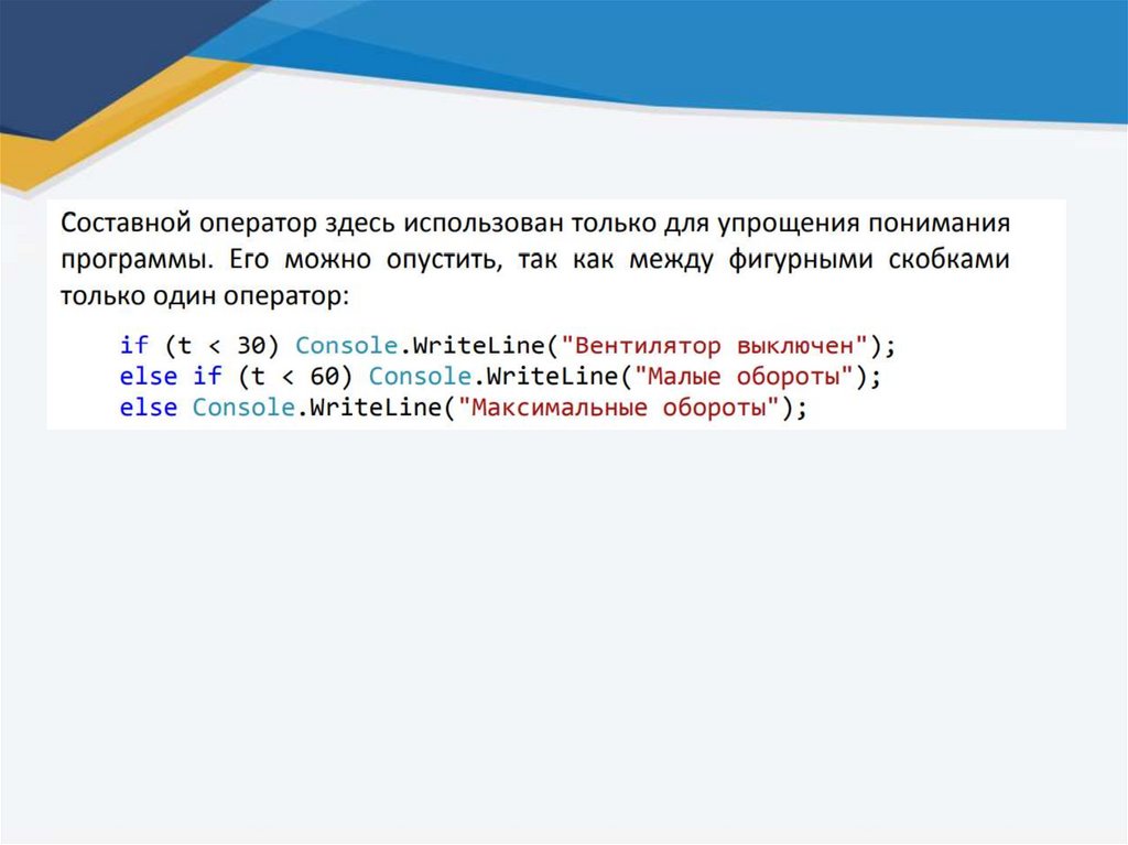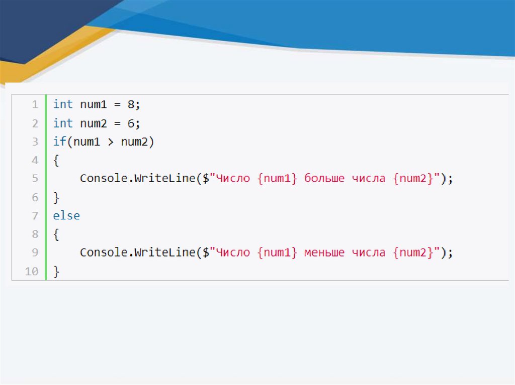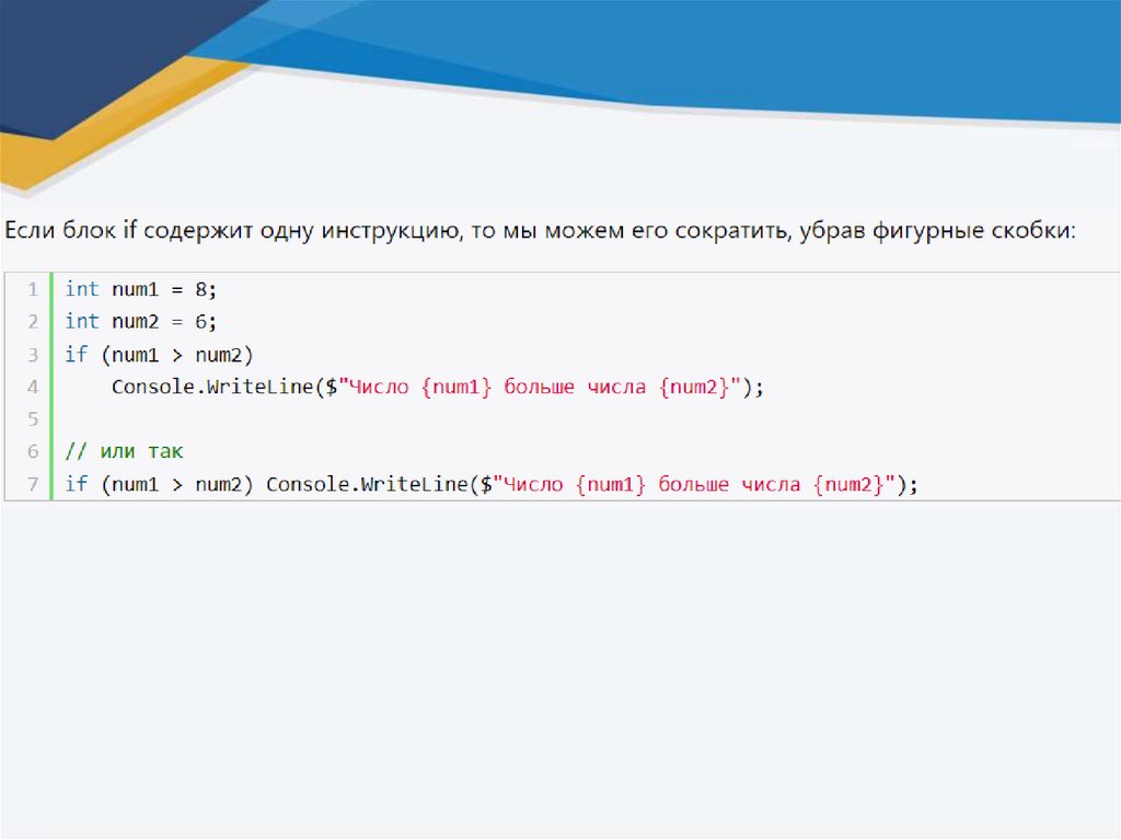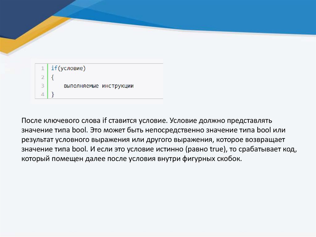 После ключевого слова if ставится условие. Условие должно представлятьзначение типа bool. Это может быть непосредственно значение типа bool или
