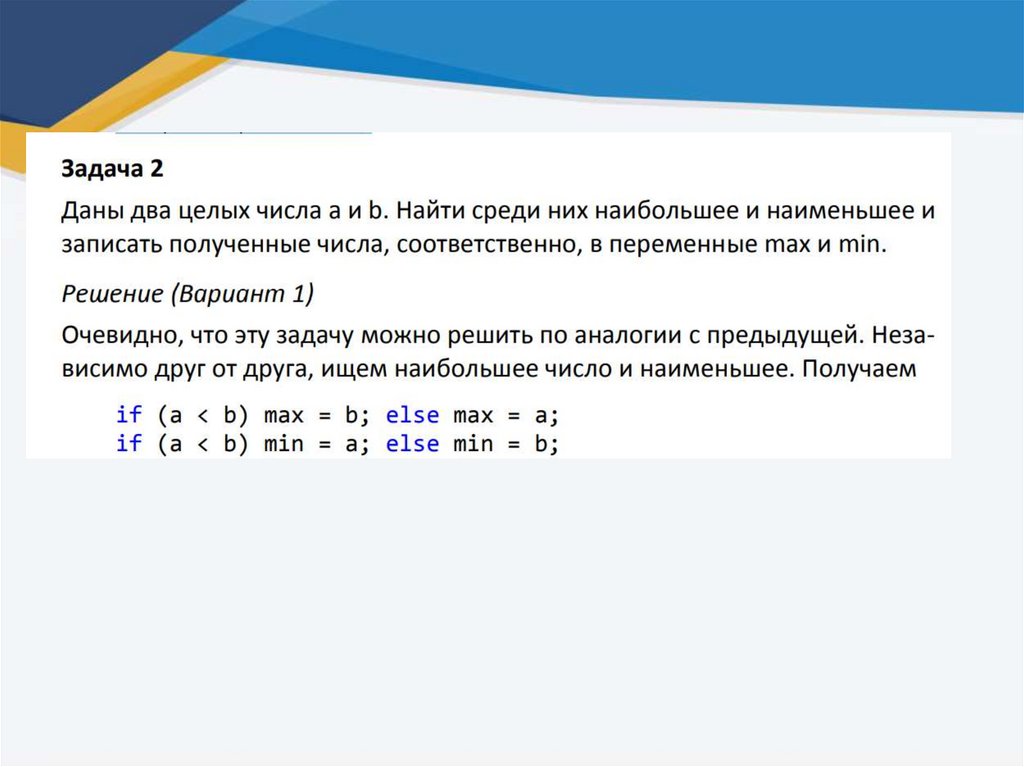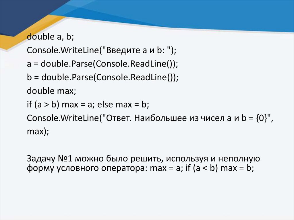 Console.WriteLine("Ответ. Наибольшее из чисел a и b = {0}",