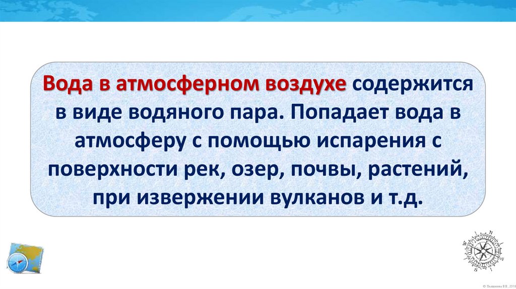 Вода в атмосферном воздухе содержитсяв виде водяного пара. Попадает вода в