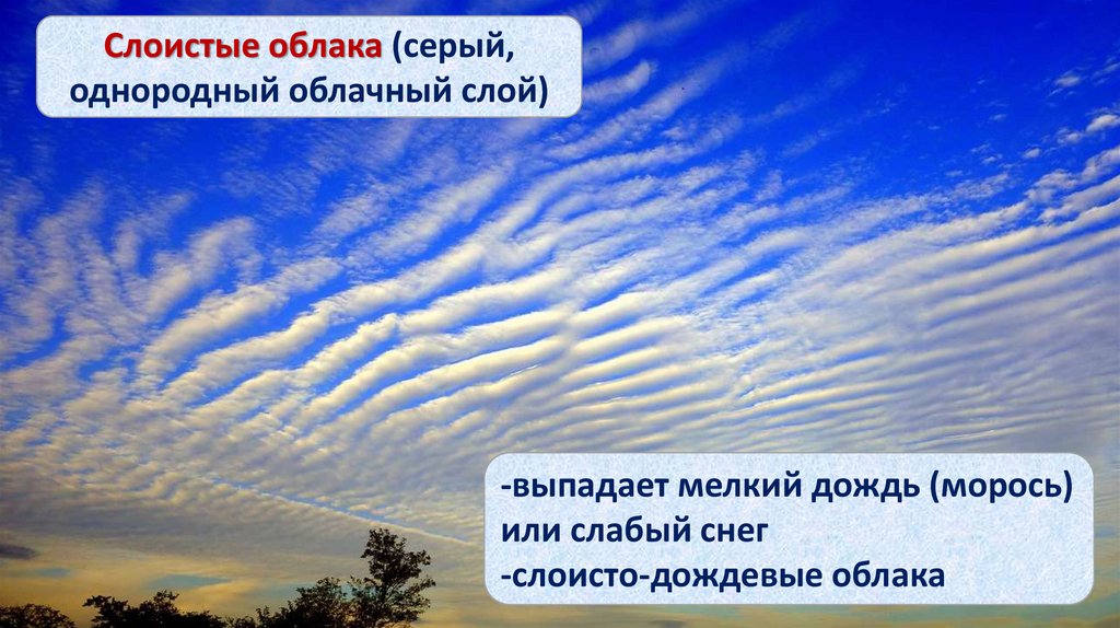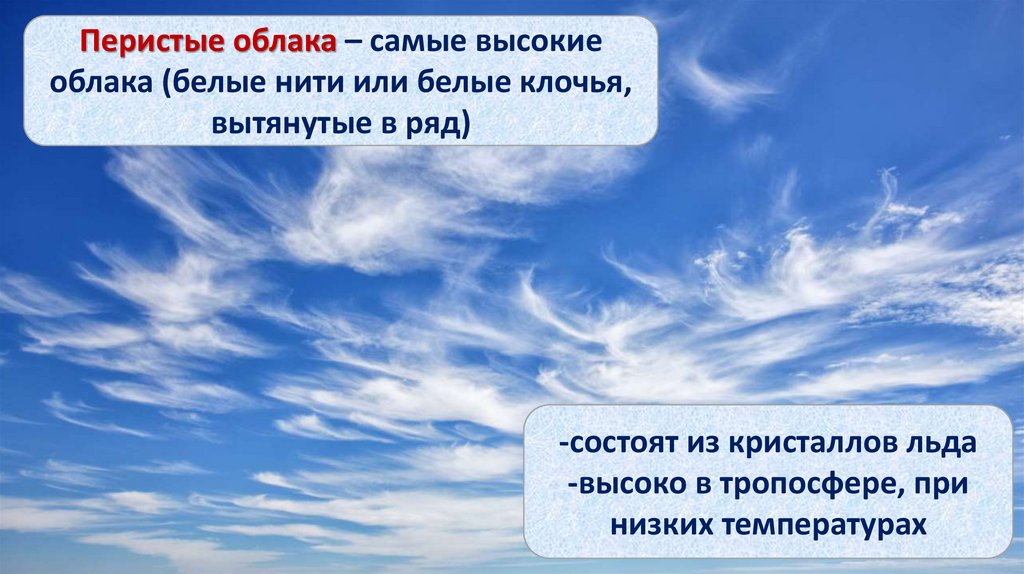 Перистые облака – самые высокиеоблака (белые нити или белые клочья,