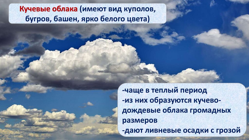 Кучевые облака (имеют вид куполов,бугров, башен, ярко белого цвета)
