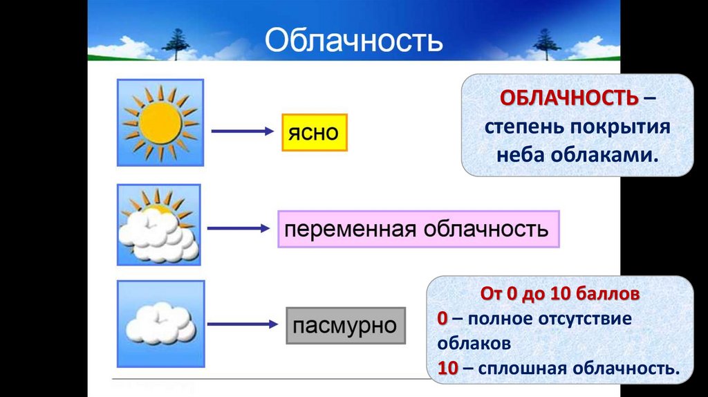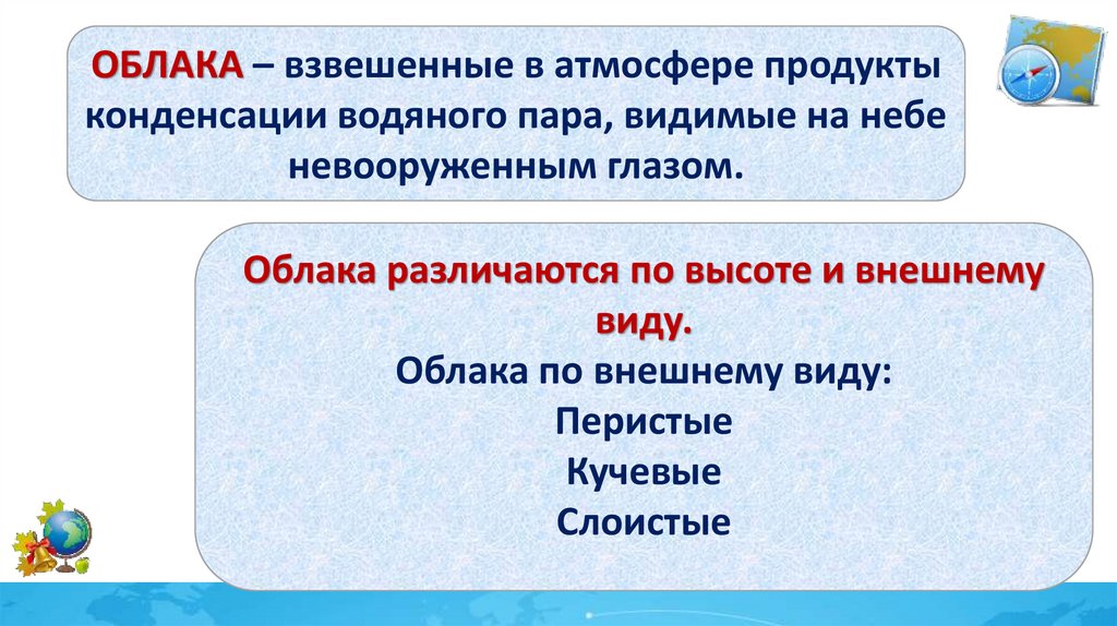 ОБЛАКА – взвешенные в атмосфере продуктыконденсации водяного пара, видимые на небе