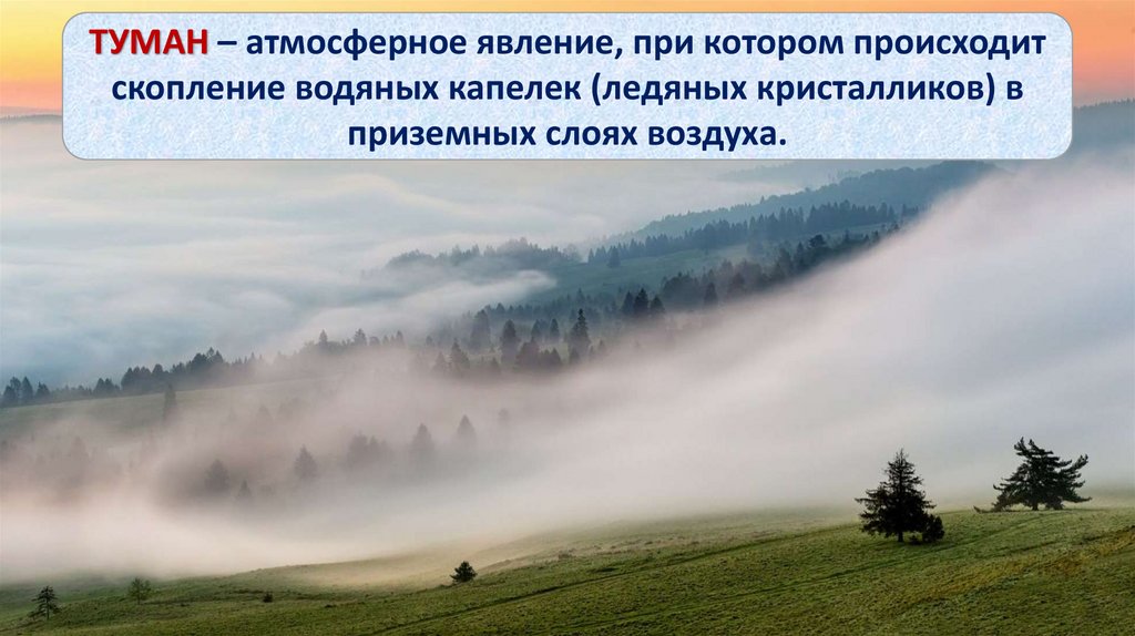 ТУМАН – атмосферное явление, при котором происходитскопление водяных капелек (ледяных кристалликов) в