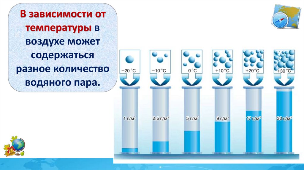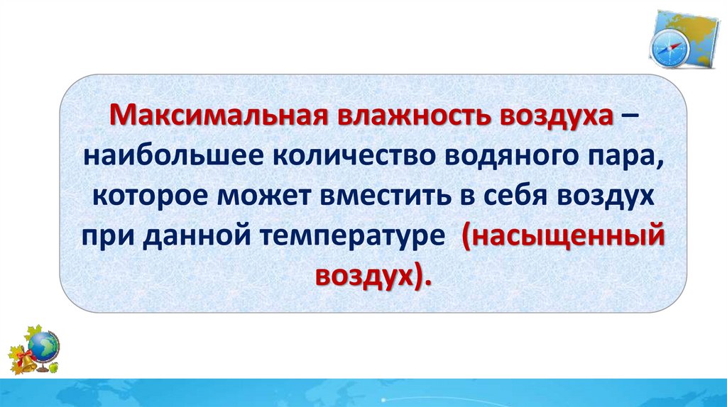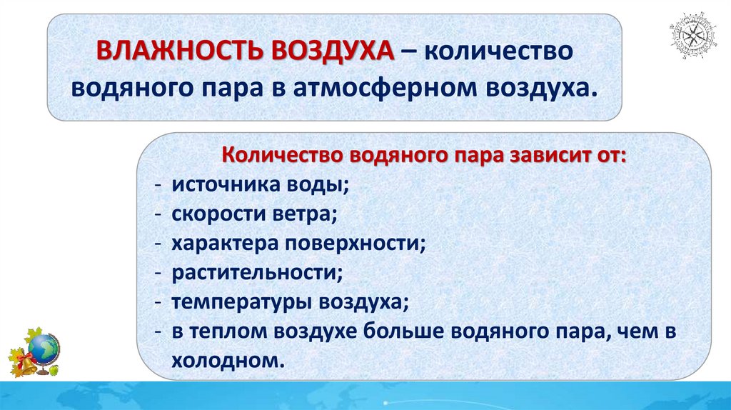 ВЛАЖНОСТЬ ВОЗДУХА – количествоводяного пара в атмосферном воздуха.