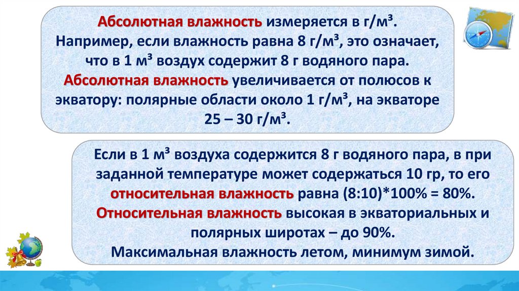Абсолютная влажность измеряется в г/м³.Например, если влажность равна 8 г/м³, это означает,