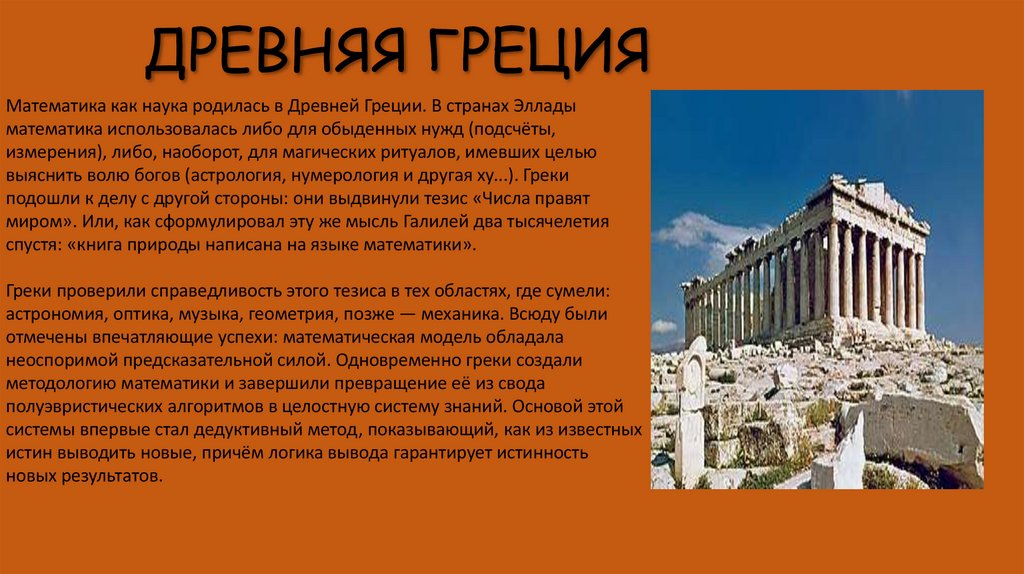 ДРЕВНЯЯ ГРЕЦИЯМатематика как наука родилась в Древней Греции. В странах Эллады