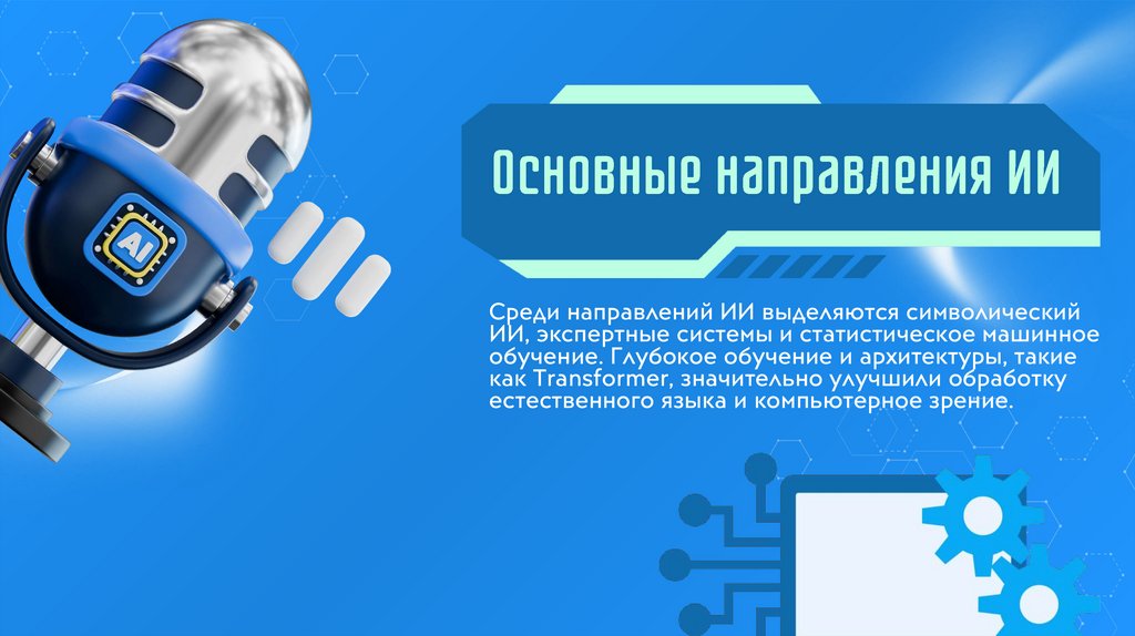 Среди направлений ИИ выделяются символическийИИ, экспертные системы и статистическое машинное