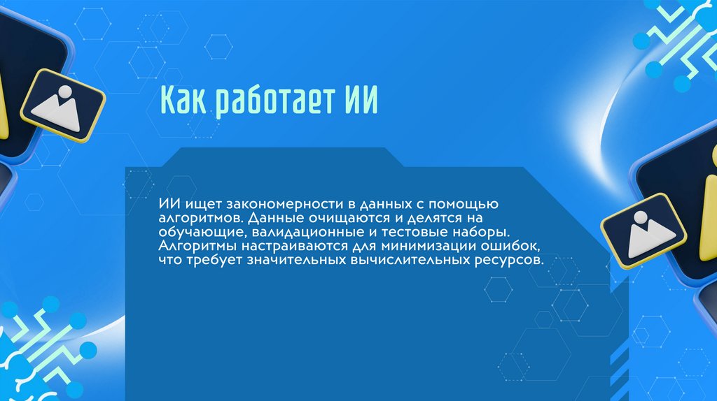 ИИ ищет закономерности в данных с помощьюалгоритмов. Данные очищаются и делятся на