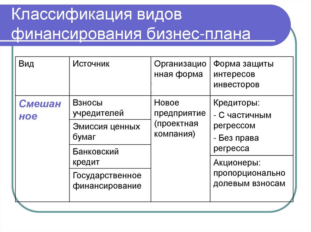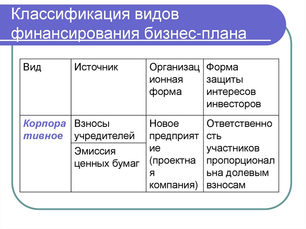 источников финансирования бизнесплана