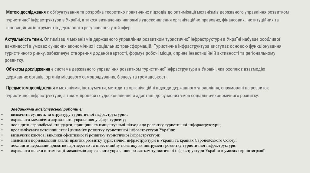 Метою дослідження є обґрунтування та розробка теоретико-практичних підходів до оптимізації механізмів державного управління розвиткомтуристичної інфраструктури в Україні, а також визначення напрямів удосконалення організаційно-правових, фінансових, інституційних та