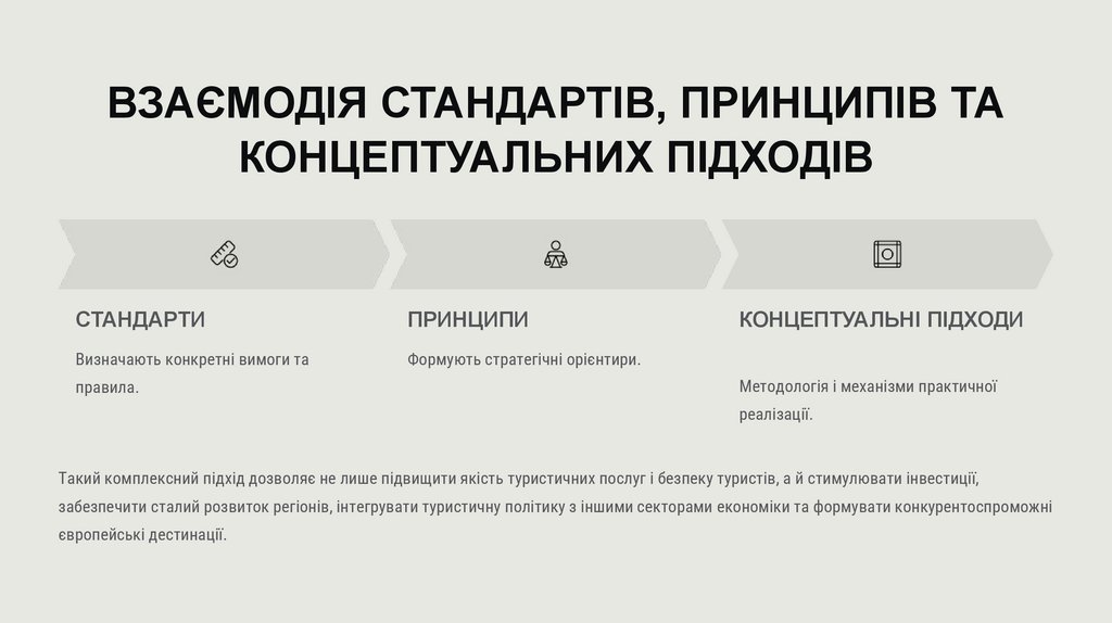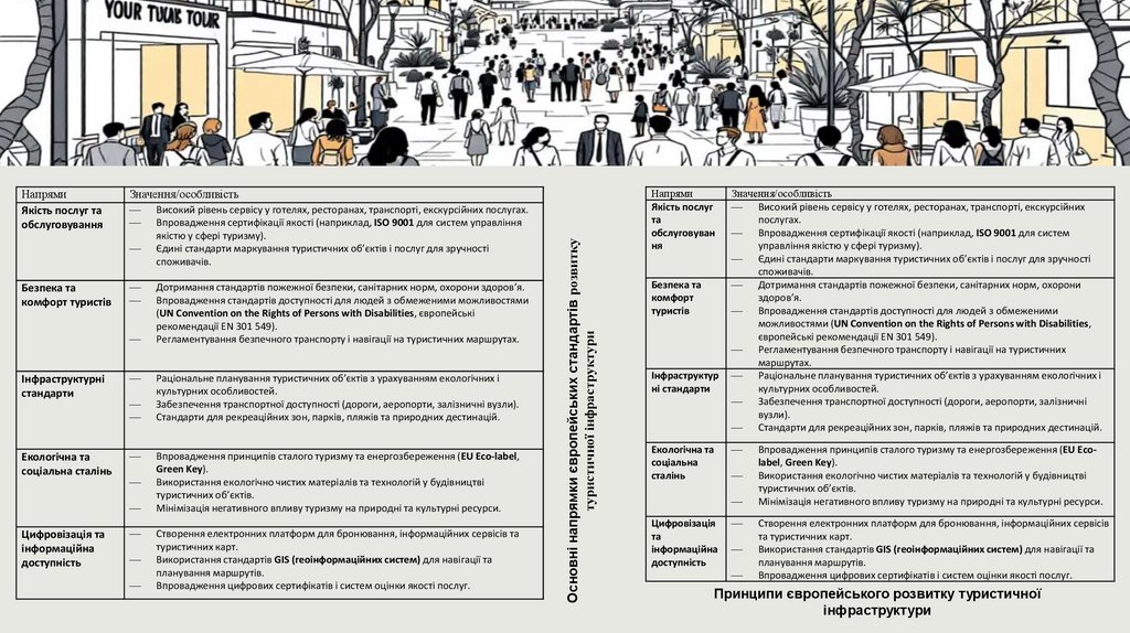 дослідити європейські стандарти, принципи та концептуальні підходи до розвитку туристичної інфораструктури;