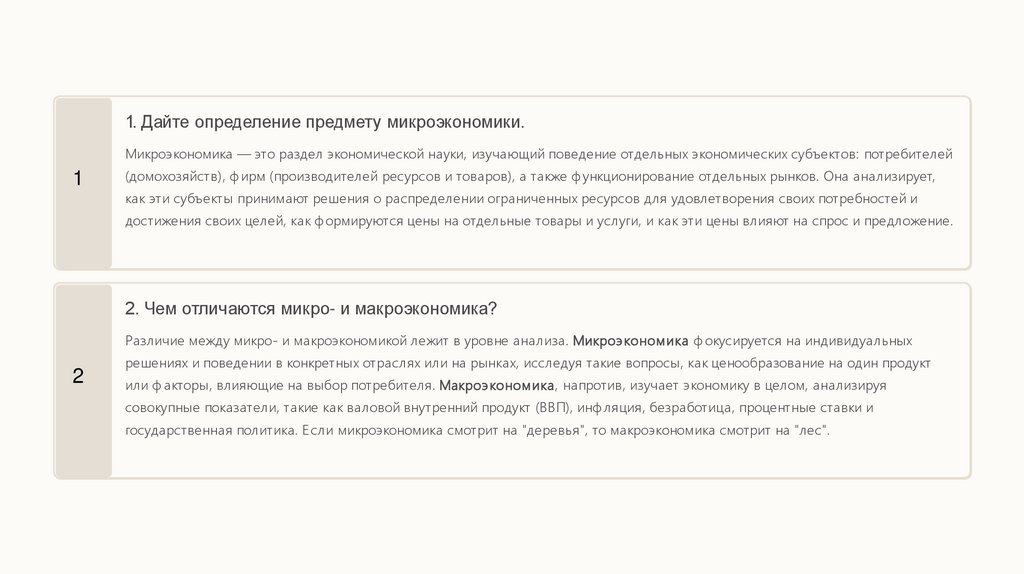 1. Дайте определение предмету микроэкономики.Микроэкономика — это раздел экономической науки, изучающий поведение отдельных экономических субъектов: потребителей