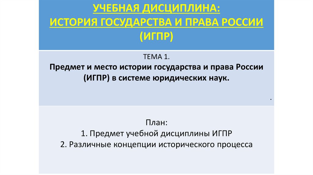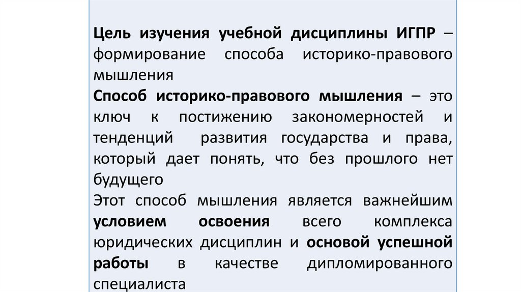 Цель изучения учебной дисциплины ИГПР –формирование способа историко-правового