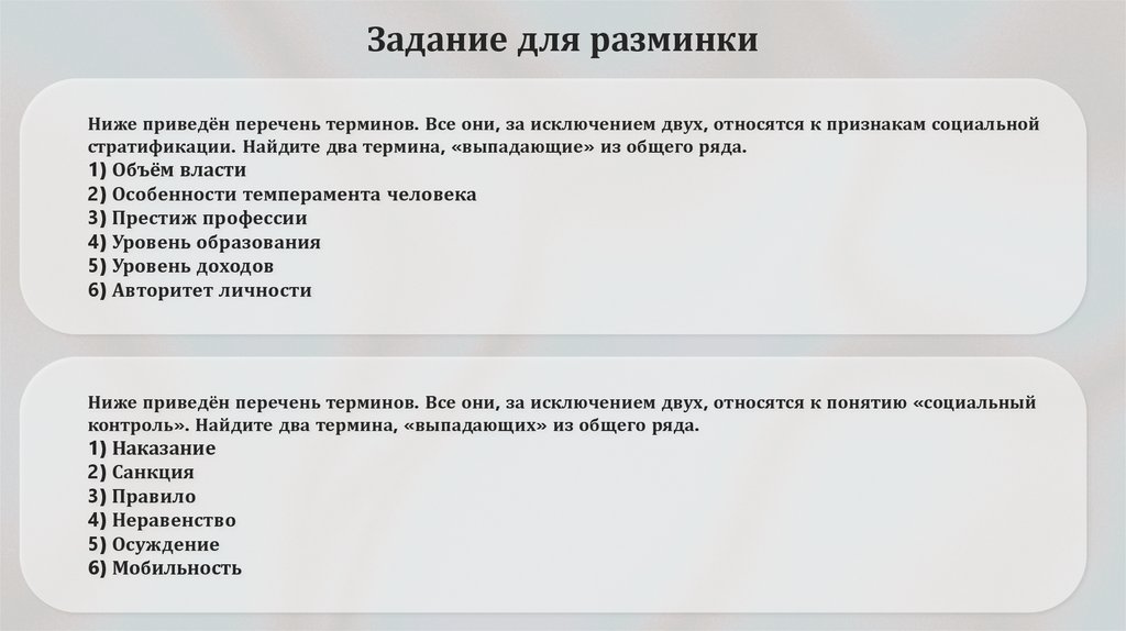 Задание для разминкиНиже приведён перечень терминов. Все они, за исключением двух, относятся к признакам социальной