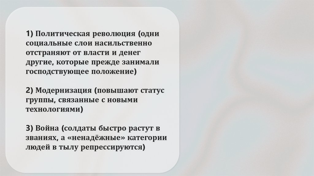 1) Политическая революция (однисоциальные слои насильственно