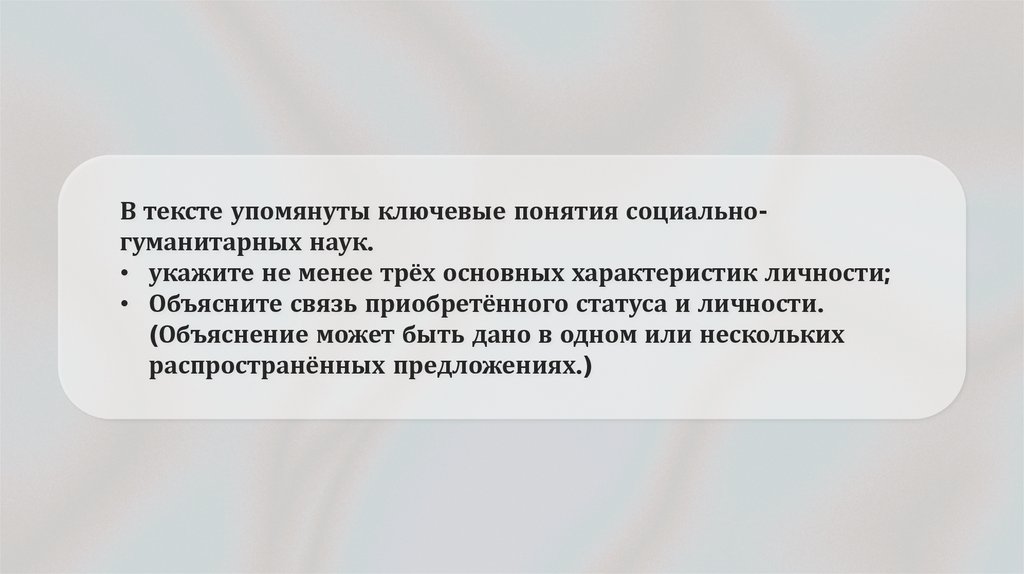 В тексте упомянуты ключевые понятия социальногуманитарных наук.• укажите не менее трёх основных характеристик личности;