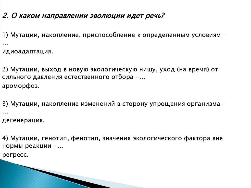 2. О каком направлении эволюции идет речь?1) Мутации, накопление, приспособление к определенным условиям –