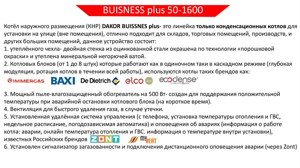 BUISNESS plus 50-1600Котёл наружного размещения (КНР) DAKOR BUISSNES plus- это линейка только конденсационных котлов для