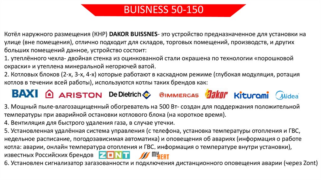BUISNESS 50-150Котёл наружного размещения (КНР) DAKOR BUISSNES- это устройство предназначенное для установки на