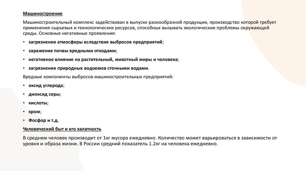 работающих цехов. Негативное влияние оказывают складированные отходы и сброс отработанных стоков в