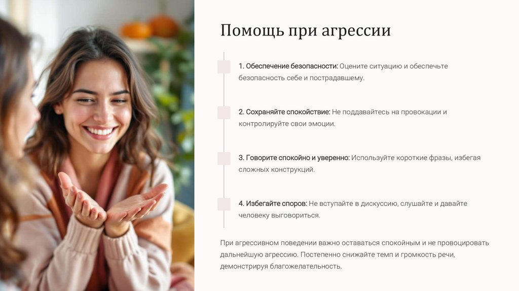 Помощь при агрессии1. Обеспечение безопасности: Оцените ситуацию и обеспечьте