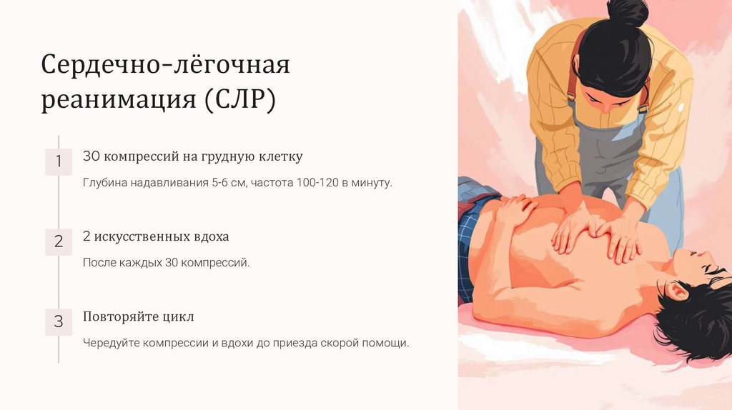 Чередуйте компрессии и вдохи до приезда скорой помощи.