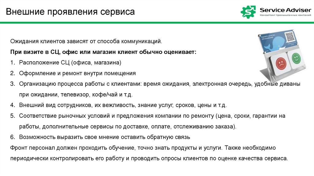 При визите в СЦ, офис или магазин клиент обычно оценивает: