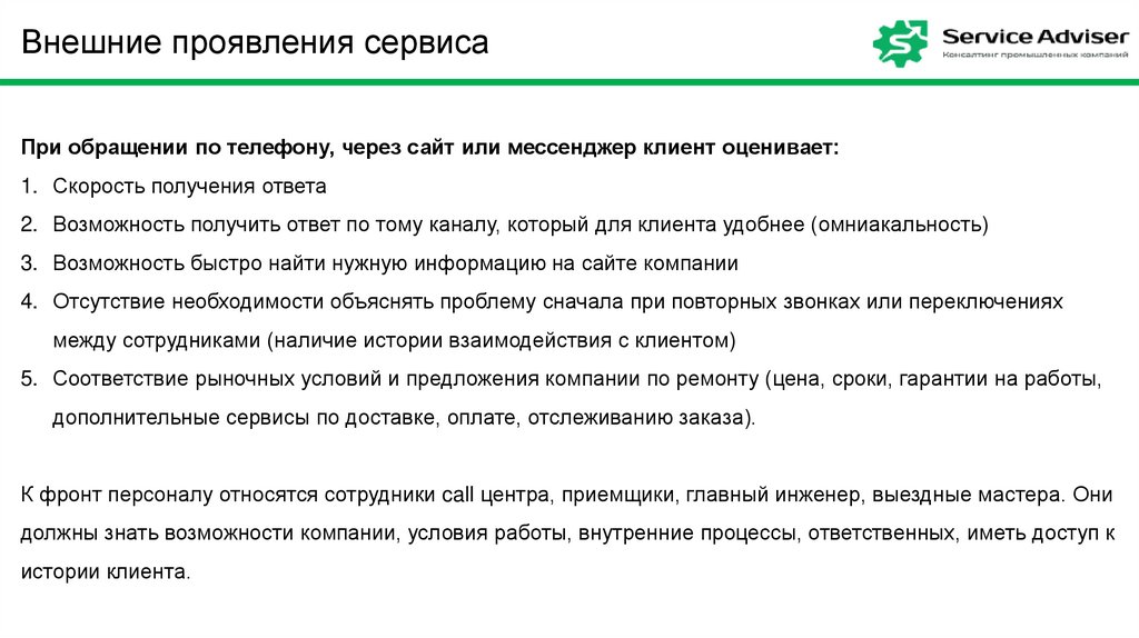 Внешние проявления сервисаПри обращении по телефону, через сайт или мессенджер клиент оценивает: