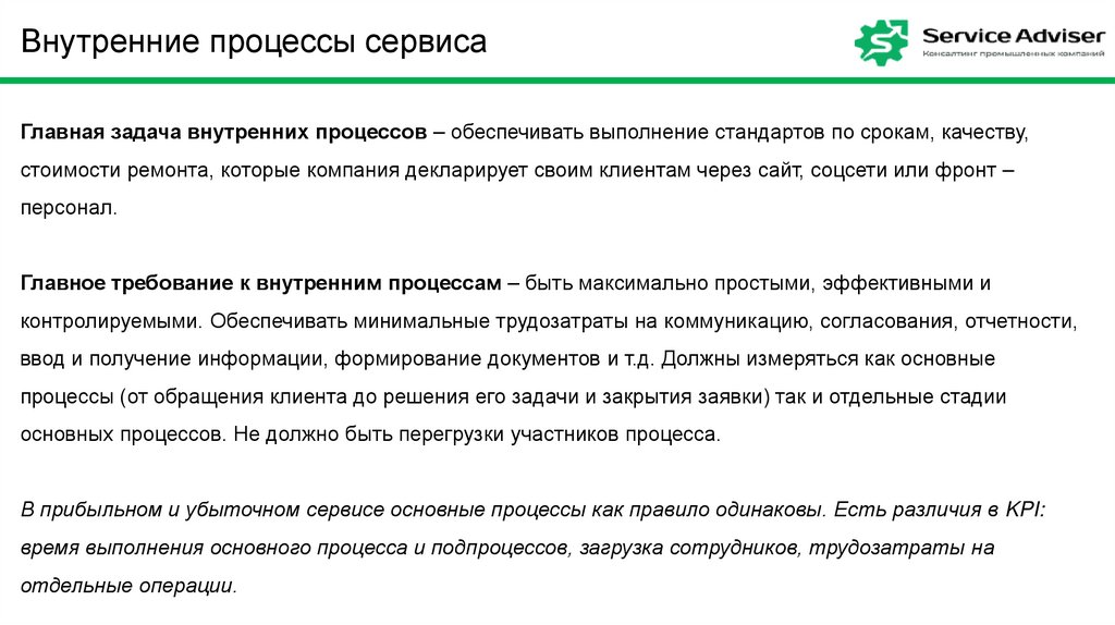 Внутренние процессы сервисаГлавная задача внутренних процессов – обеспечивать выполнение стандартов по срокам, качеству,