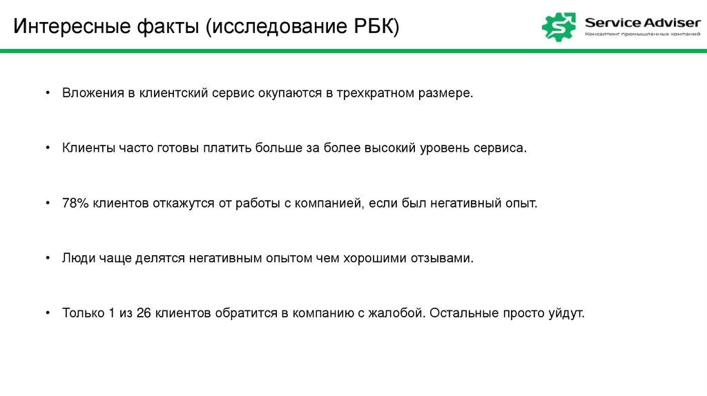 Интересные факты (исследование РБК)• Вложения в клиентский сервис окупаются в трехкратном размере.