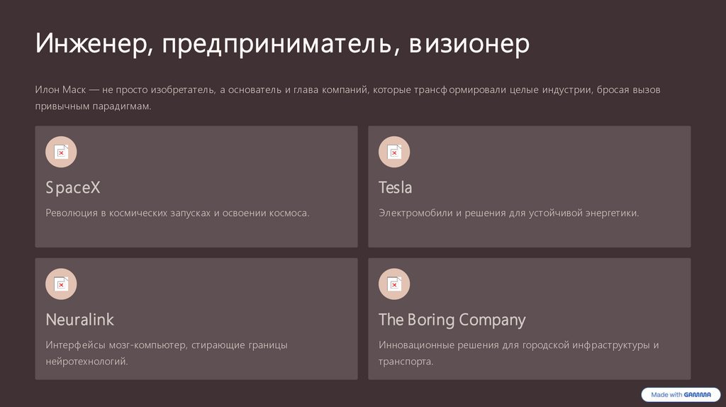 Инженер, предпринимател ь , в изионерИлон Маск — не просто изобретатель, а основатель и глава компаний, которые трансф ормировали целые индустрии, бросая вызов