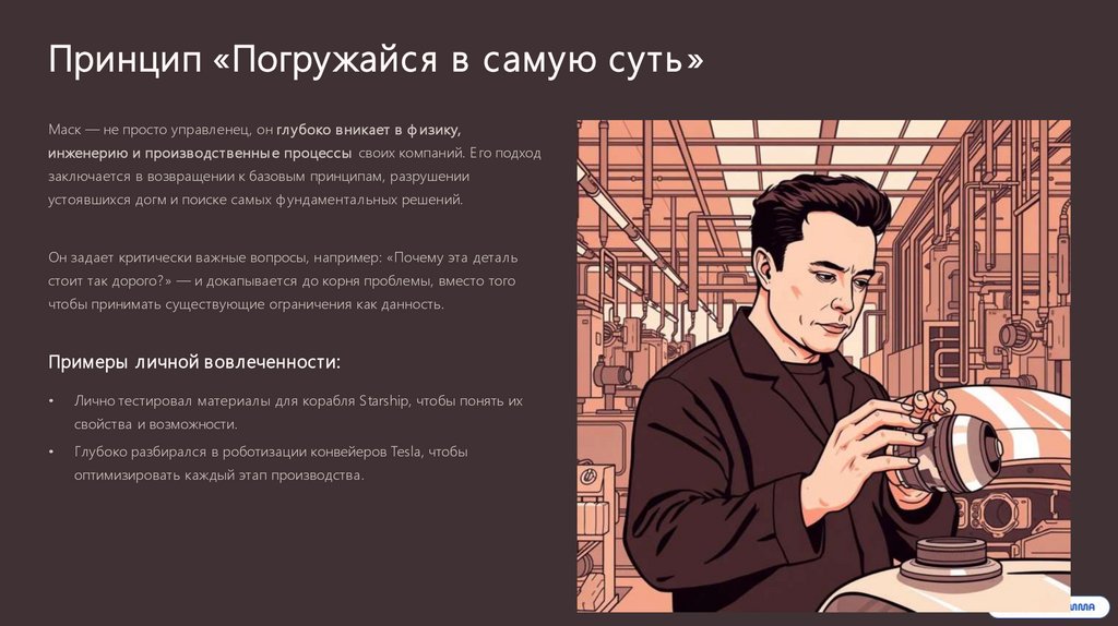 Принцип «Погружайся в самую суть »Маск — не просто управленец, он глубоко вникает в ф изику,