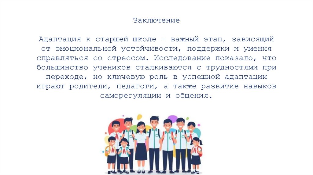 ЗаключениеАдаптация к старшей школе – важный этап, зависящий