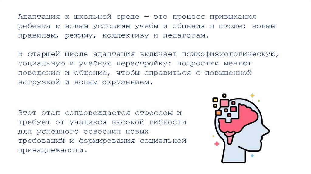Адаптация к школьной среде — это процесс привыканияребенка к новым условиям учебы и общения в школе: новым