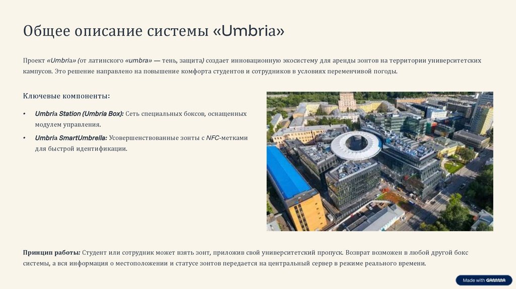 Общее описание системы «Umbriа»Проект «Umbriа» (от латинского «umbra» — тень, защита) создает инновационную экосистему для аренды зонтов на территории университетских