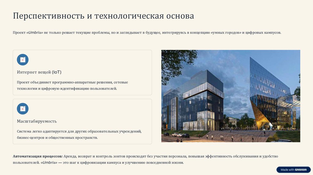 Перспективность и технологическая основаПроект «Umbriа» не только решает текущие проблемы, но и заглядывает в будущее, интегрируясь в концепцию «умных городов» и цифровых кампусов.