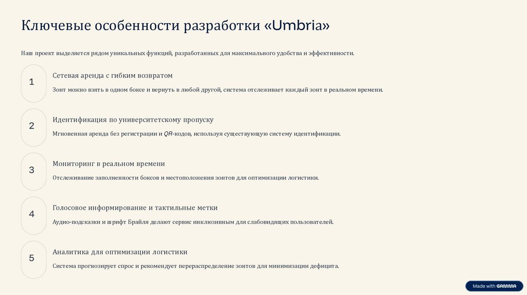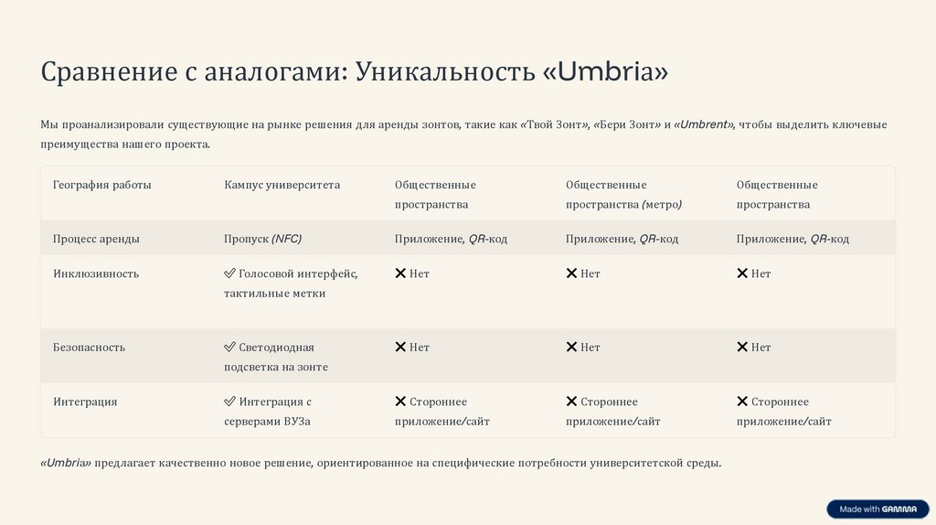 Сравнение с аналогами: Уникальность «Umbriа»Мы проанализировали существующие на рынке решения для аренды зонтов, такие как «Твой Зонт», «Бери Зонт» и «Umbrent», чтобы выделить ключевые