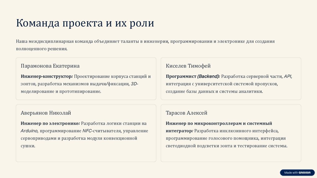Команда проекта и их ролиНаша междисциплинарная команда объединяет таланты в инженерии, программировании и электронике для создания