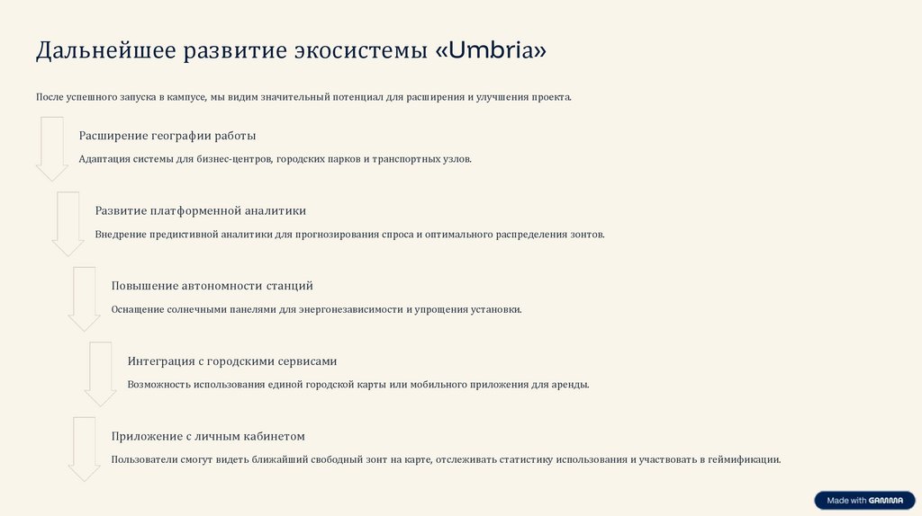 Дальнейшее развитие экосистемы «Umbriа»После успешного запуска в кампусе, мы видим значительный потенциал для расширения и улучшения проекта.