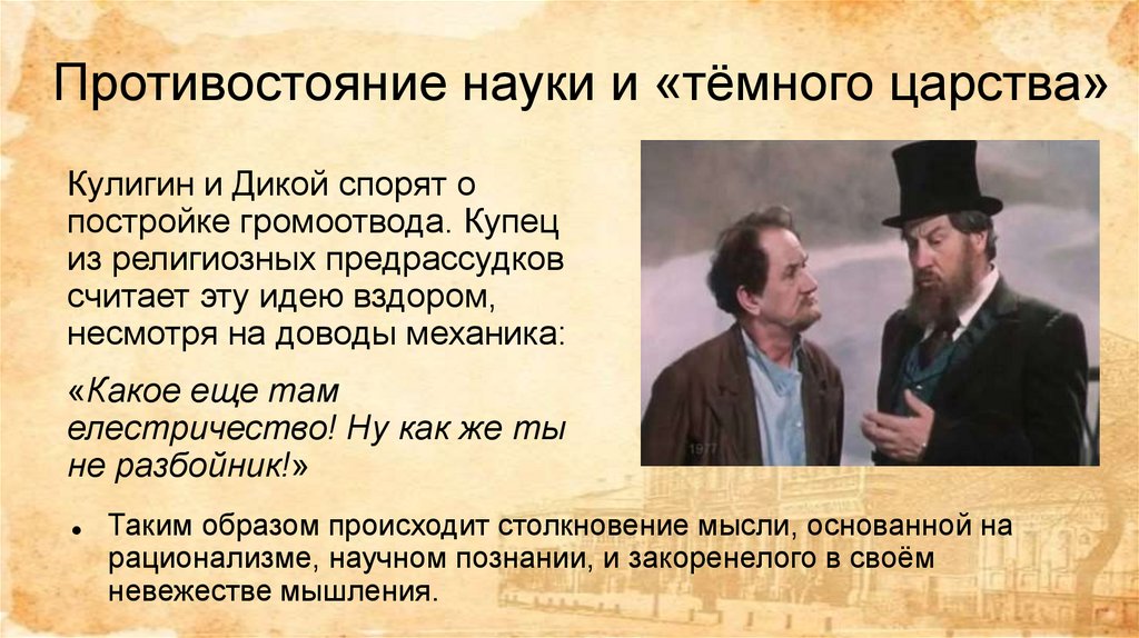 Противостояние науки и «тёмного царства»Кулигин и Дикой спорят о